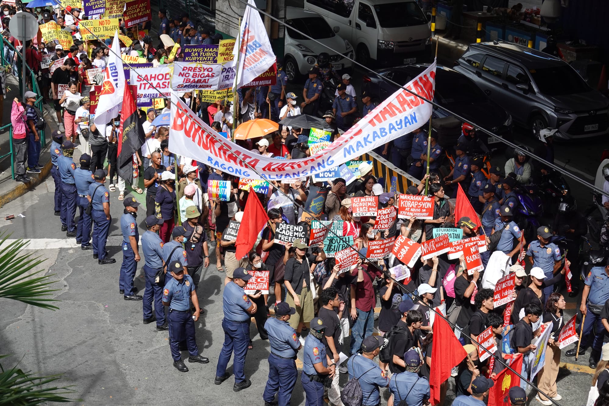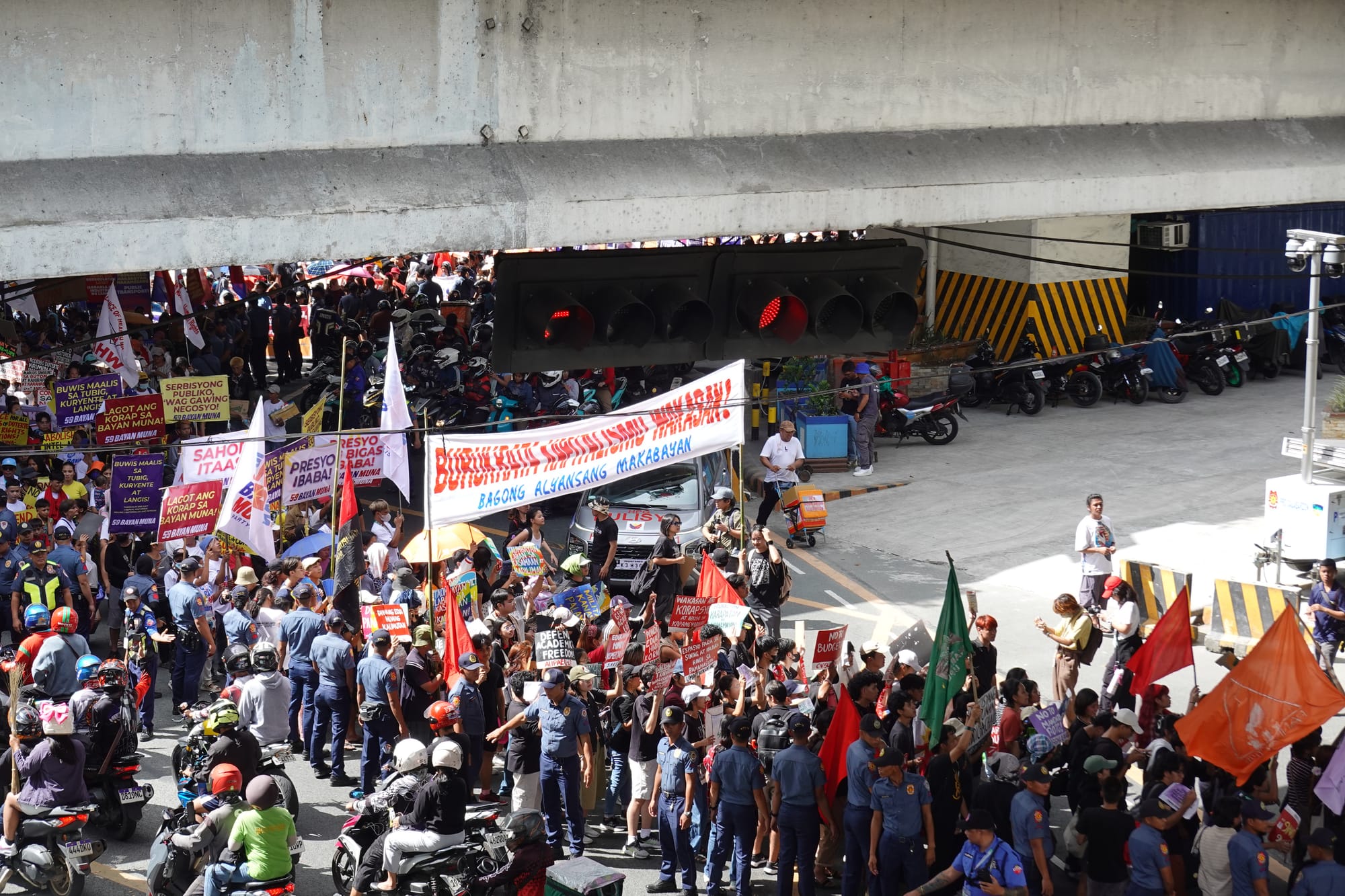 The march began at EDSA (Epifanio de los Santos Avenue) near Camp Aguinaldo, moving south about a kilometer to the EDSA Shrine on Ortigas Ave., where the PNP (Philippine National Pigs) formed a semicircle enclosing the march and forcing it to turn around. Of course, the march was planned in advance, with appropriate permissions and all - but the lineup of cops doesn't get less menacing because of that. Coming off of a decade in NYC, seeing what the fucking NYPD are capable of, I felt angry and defeggressive (defensive/aggressive?) but kasama and I, while we were handing out pamphlets and printouts, were able to get through them easily to climb the stairs to the pedestrian over/underpass, where a line of masa were looking on. I got a few decent photos of the police lineup, featuring a killer banner made by BAYAN screaming "BUROKRATA KAPITALISMO WAKASAN!" (END BUREAUCRAT CAPITALISM!)